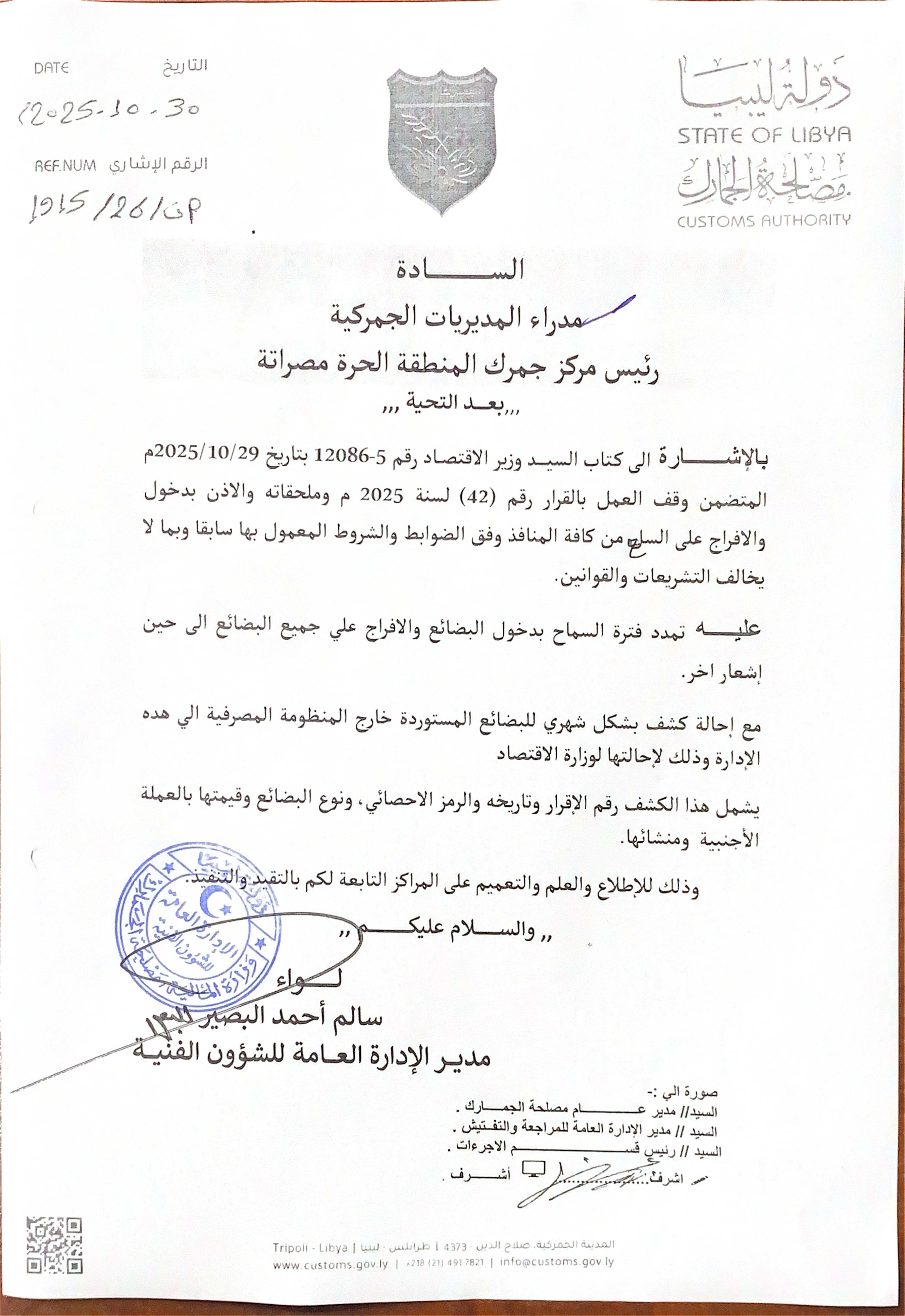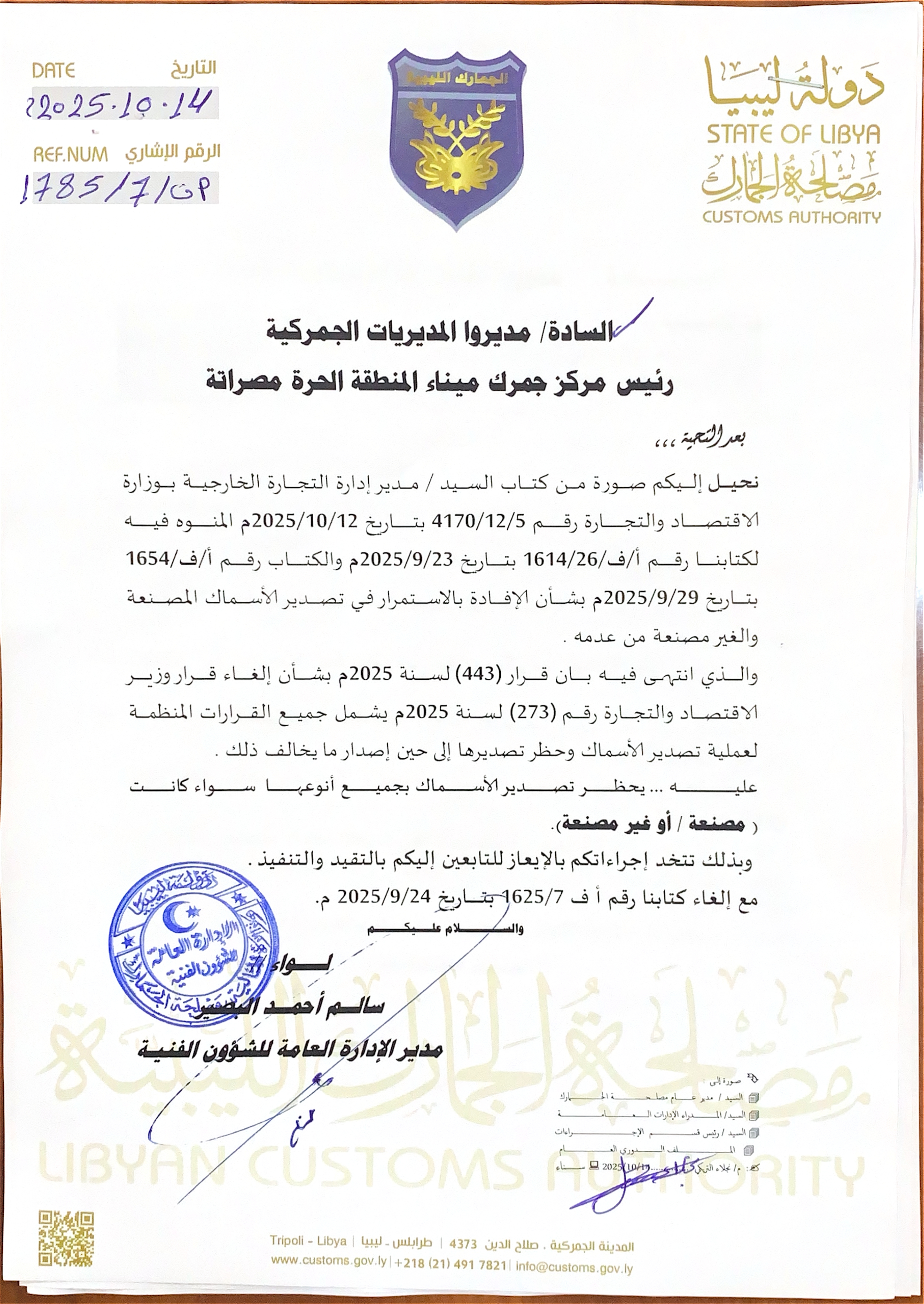 كتاب مدير مصلحة الجمارك لمديريات والمراكز الجمركية والمنطقة الحرة بمصراتة بشأن حظر تصدير الأسماك بجميع أنواعها المصنعة وغير المصنعة .